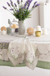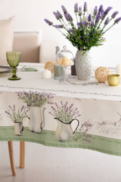 Все скатерти коллекции «ЛАВАНДОВОЕ ЛЕТО» имеют специальную пропитку (влаго-, масло- и грязеотталкивающую обработку). Принт на ткани нанесен методом цифровой печати с использованием высококачественных красителей, благодаря чему изделия не линяют и не меняют свой цвет после многократных стирок. Рисунок по ткани виден только на лицевой стороне. ЭКСКЛЮЗИВНЫЙ ДИЗАЙН: В жаркие летние дни поля, усеянные кустами лаванды, окрашиваются в новые цвета и воздух наполняется ароматами цветов. Цветами лаванды наполняют дом и размещают в колоритную посуду: чайник, кувшин, кружки. Это смотрится так естественно и гармонично. Ведь цветы лаванды погружают в атмосферу романтики и прованса, создают приятное настроение. Скатерть коллекции «ЛАВАНДОВОЕ ЛЕТО» размером 145х225см прямоугольная. Скатерть белая, с зеленой каймой и принтом в виде лаванды. Углы скатерти обработаны как «евроугол». Скатерть 145х225см подходит для прямоугольного стола шириной 70…80…90…100см и длиной 150...160...170...180см.