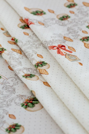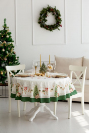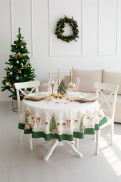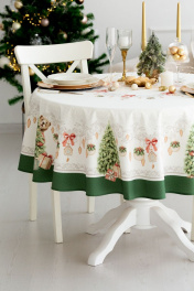 Все скатерти коллекции «НОВОГОДНЯЯ ШКАТУЛКА» имеют специальную пропитку (влаго-, масло- и грязеотталкивающую обработку). Принт на ткани нанесен методом цифровой печати с использованием высококачественных красителей, благодаря чему изделия не линяют и не меняют свой цвет после многократных стирок. Рисунок по ткани виден только на лицевой стороне. ЭКСКЛЮЗИВНЫЙ ДИЗАЙН: Скатерть коллекции «НОВОГОДНЯЯ ШКАТУЛКА» диаметром 170см круглая. Край скатерти обметан и подложен. Скатерть D-170см подходит для круглого стола диаметром 100…110…120см. Скатерть белая, с зеленой каймой, елочными игрушками и чудесной елкой. Упаковка товара: Коробка с окошком; 38х30х4