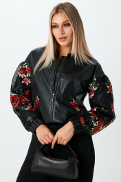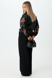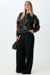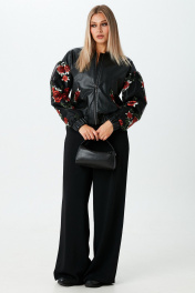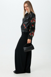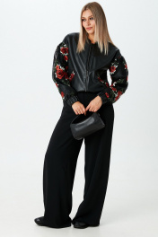 Комплект 2ка, состоящий из бомбера и брюк. Бомбер из экокожи с объёмными рукавами и застёжкой на молнию. Манжеты и низ бомбера на резинке. Карманы и рукава бомбера декорированы сеткой с цветочной вышивкой. Брюки широкого объема, прямого силуэта. В боковых швах расположены карманы. Застежка-гульфик. Пояс отрезной, притачной. В задней части пояса вставлена эластичная тесьма (резинка). Пояс застегивается на петлю и крючок.