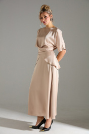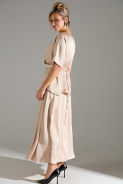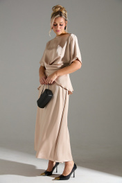 Костюм 2ка из лёгкой струящейся ткани с атласным благородным блеском, состоящий из блузки и юбки. Блузка свободного объёма, по переду имитация застежки на запАх. В комплекте шнур из основной ткани, которым можно приталить блузу, обвязав по кругу, или продеть через боковые швы и завязать по спинке. Юбка широкого объёма, длины "миди".
