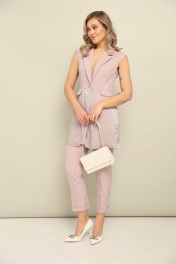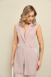 Костюм 2ка, состоящий из жилета и брюк. Удлиненный приталеный жилет с отложным вортником и лацканами. Застёжка центральная на пуговицу и петлю. По бокам выполнена имитация карманов с калапанами. Нижняя часть жилета состоит из двух слоёв: верхний -из лёгкой шифоновой ткани со стразами, нижний- из основной ткани . Длина по спинке 83-85 см. Брюки свободного прилегания по бедрам и зауженные к низу. Пояс на эластичной тесьме с кулисой и втянутым шнурком. Вход в карман фигурный, наклонный к боковому шву.
