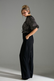 Комплект 2-ка, состоящий из жакета и брюк. Жакет с застёжкой на молнию и объёмными рукавами. Линия талии на кулисе и завязке из основной ткани. Брюки широкого объема, прямого силуэта. В боковых швах расположены карманы. Застежка-гульфик. Пояс отрезной, притачной. В задней части пояса вставлена эластичная тесьма (резинка). Пояс застегивается на петлю и крючок.