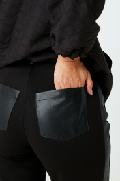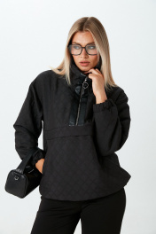 Комплект 2ка, состоящий из джемпера и брюк. Джемпер свободного объёма из стёганой ткани. Горловина на молнии с окантовкой из экокожи. Манжеты и низ джемпера на резинке. По бокам расположены карманы.Брюки прямого силуэта свободного объёма. Застёжка на молнию и пуговицу. Вдоль боковых швов расположены лампасы из экокожи. Пояс и задние накладные карманы также выполнены из экокожи.