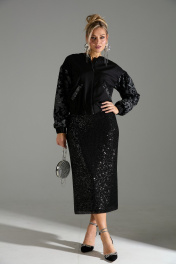 Комплект 2ка, состоящий из бомбера и юбки. Бомбер свободного силуэта с объёмными рукавами и застёжкой на молнию. Манжеты и низ бомбера на резинке. Карманы и рукава бомбера декорированы кружевной тканью расшитой пайетками. Юбка- карандаш длиной ниже колена прямого силуэта. Пояс юбки и подкладка выполнены из эластичного трикотажа. Верхний слой юбки из лёгкой ткани расшитой пайетками. Застёжка на потайную молнию в среднем шве по спинке, разрез расположен внизу среднего шва.