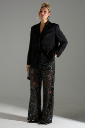 Комплект 2-ка, состоящий из жакета и брюк. Жакет однобортный объёмного силуэта с расширенным плечевым поясом. Застёжка на одну пуговицу. Из бокового шва выходит декоративная пата. По полочки распложены три прорезных кармана с клапанами, два из которых функциональные. Брюки прямые из полупрозрачной кружевной ткани расшитой пайетками, на эластичном поясе-резинке. Брюки дополнены подкладкой в виде шорт, закрывающих линию бёдер.