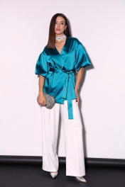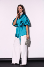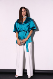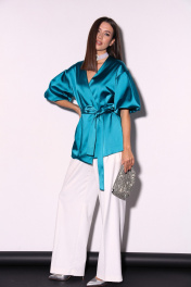 Комплект 2ка, состоящий из жакета и брюк. Легкий жакет на подкладке с объёмными рукавами. Перед на запАх без застежки, под пояс по талии. Длина жакета по спинке 70-78 см. Брюки широкого объема, прямого силуэта. На передних половинках брюк заутюжены стрелки, переходящие в складки по линии талии. На задних половинках также заутюжены стрелки. В боковых швах расположены карманы. Застежка-гульфик. Пояс отрезной, притачной. В задней части пояса вставлена эластичная тесьма (резинка). На пояс настрочены шлевки. Выступающая часть пояса застегивается на петлю и крючок. Рост фотомодели 175 см. Размер у фотомодели – 44.