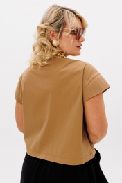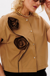Комплект 2ка, состоящий из блузки и юбки. Укороченная блузка с короткими рукавами и застёжкой на пуговицы. Вырез горловины круглый. По переду блузки выполнен декор из основной ткани в виде цветов. Юбка - силуэта «трапеция», широкого объёма, длина миди, талия на резинке. Спереди юбка дополнена уникальными карманами, входящими в талиевый шов и свободно висящие по низу.