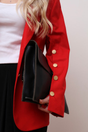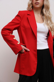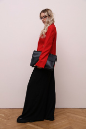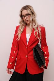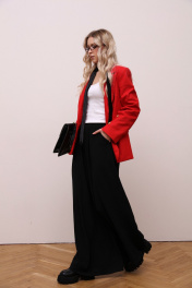 Комплект 2ка, состоящий из жакет и брюк. Яркий однобортный жакет приталенного силуэта с застёжкой на 2 пуговицы. По бокам расположены функциональные прорезные карманы с клапанами. Жакет на подкладке. На рукавах жакета выполнены функциональные застёжки на петли и пуговицы. Брюки широкого объема. По центру переда заложены две широкие встречные складки на каждой половинке. В боковых швах расположены карманы с наклонным входом. Талия на резинке. Ткань струящаяся и не мнется. СОВЕТ ОТ СТИЛИСТА: для нарядного выхода под жакет можно надеть брюки палаццо в белом цвете, а для повседневного образа можно носить джинсами среднего объема. Черные брюки на резинке из немнущейся ткани легко сочетать с любыми рубашками, майками и джемперами.