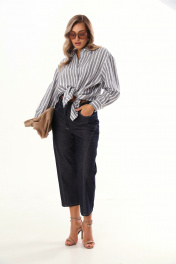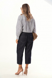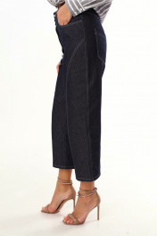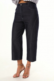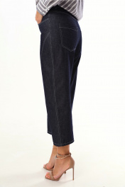 Брюки капри, зауженные и укороченные к низу, выполнены из джинсовой ткани. По переду и сзади расположены карманы. Застежка на пуговицу и молнию.