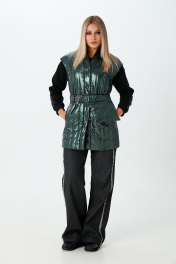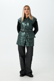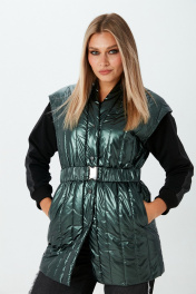 Утеплённый жилет из стёганой ткани. Застёжка на кнопки, по бокам расположены карманы. В комплекте идёт эластичный ремень, который дополняется съёмным карманом-сумкой. Жилет на подкладке.