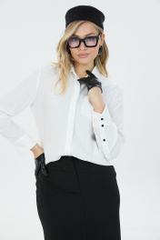Блузка из лёгкой ткани с застёжкой-планкой на петли и пуговицы. По переду расположен накладной карман.