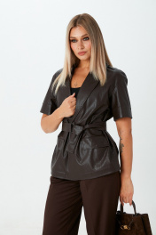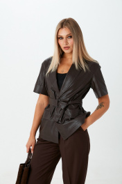 Жакет из экокожи на вискозе с короткими рукавами, без подкладки. Застёжка на пуговицы. По переду имитация карманов с клапанами. В комплекте идёт пояс с пряжкой.