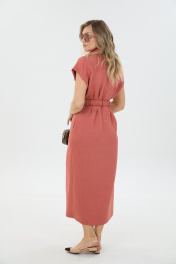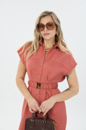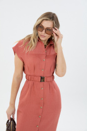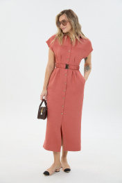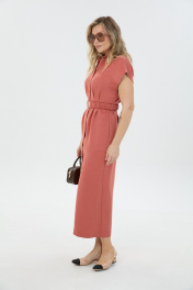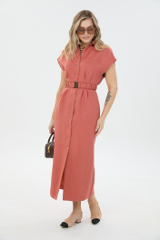 Платье умеренного объёма со спущенной линией плеча длиной ниже колена. Застёжка по переду на петли и пуговицы переходящая в разрез. Воротник отложной. По талии съёмный эластичный пояс.