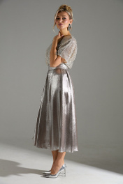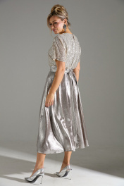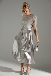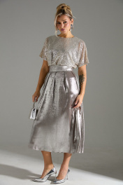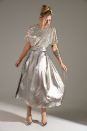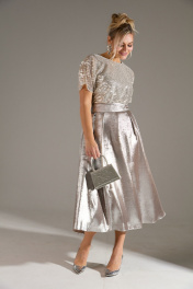 Платье длины "миди" с объёмной юбкой. Верх платья выполнен из ткани расшитой пайетками. Застежка на потайную молнию по среднему шву спинки. В комплекте идет длинный съемный пояс. На юбке по линии талии заложены складки.
