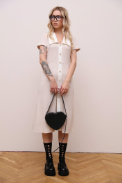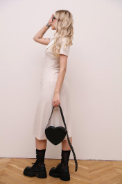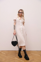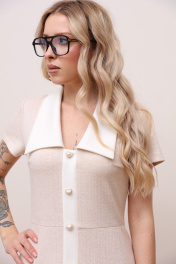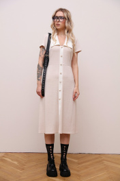 Трикотажное платье длиной ниже колена с короткими рукавами приталенного силуэта. По переду имитация планки , застежка в боковом шве на потайную молнию. Платье с отрезной линией талии, юбка расширена к низу, силуэт-трапеция. СОВЕТ ОТ СТИЛИСТА: Не бойтесь играть на контрасте и разбавлять нежный женственный образ дерзкими аксессуарами, например,как это сделали мы на фотосъемке. Также, платье будет хорошо смотреться с бежевыми базовыми лоферами, балетками и босоножками.