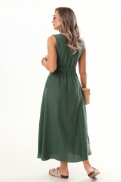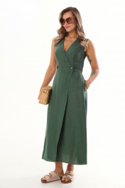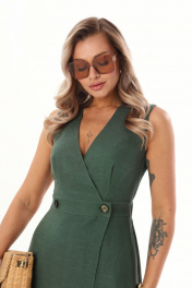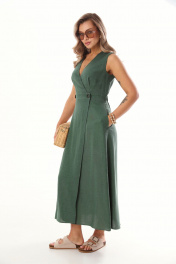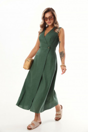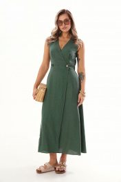 Сарафан "макси" без рукавов с застёжкой на запах на функциональные петли и пуговицы. Вырез декольте V-образный. По линии талии спинки эластичная вставлена эластичная резинка. При надобности, платье легко слегка расширить или заузить по талии, переставив пуговицы.