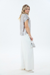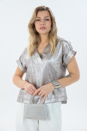 Блузка прямого силуэта свободного кроя из приятной к телу ткани с вискозной изнанкой и блестящей лицевой стороной. Спинка блузки удлинённая, горловина V-образная, на рукавах выполнены подвороты.