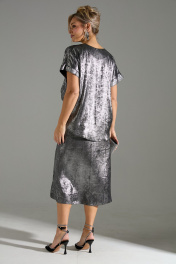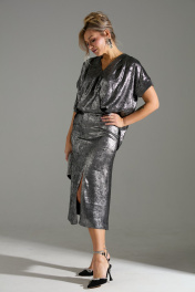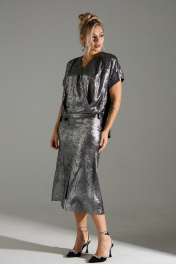 Комплект 2ка, состоящий из блузки и юбки. Блузка свободного силуэта с короткими рукавами. Горловина V-образная. Низ блузки разноуровневый: спереди короче, сзади длиннее. Блузка по талии может соединяться с юбкой с помощью молнии , создавая имитацию платья. Юбка слегка расширена к низу, длиной ниже колена. По переду юбки разрез на левую сторону. Пояс юбки по переду на эластичной тесьме, застёжка на потайную молнию.