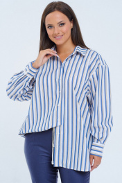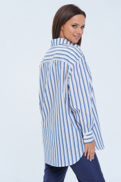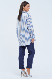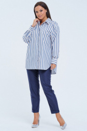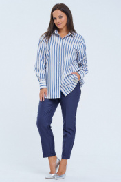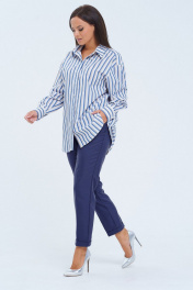 Комплект 2ка, состоящий из рубашка и брюк. Рубашка женская большого объема, прямого силуэта. На детали спинки расположена двойная кокетка, переходящая на деталь полочки. Под кокеткой на спинке встречная складка. Воротник рубашечный отложной на стойке. Застежка планка центральная на прорезные петли и пуговицы. Линия плеча спущенная, рукав рубашечный, длинный. В нижней части рукава заложены складки, заканчивается манжетой с двумя прорезными петлями и пуговицами. Низ блузки разноуровневый: спереди короче, сзади длиннее. Удобные повседневные брюки из лёгкой ткани с вискозой в составе. Брюки свободного прилегания по бедрам и зауженные к низу. Пояс на эластичной тесьме с кулисой и втянутым шнурком. Вход в карман фигурный, наклонный к боковому шву.