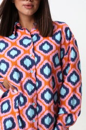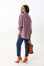 Комплект 2ка, состоящий из рубашка и брюк. Рубашка женская большого объема, прямого силуэта. На детали спинки расположена двойная кокетка, переходящая на деталь полочки. Под кокеткой на спинке встречная складка. Воротник рубашечный отложной на стойке. Застежка планка центральная на прорезные петли и пуговицы. Линия плеча спущенная, рукав рубашечный, длинный. В нижней части рукава заложены складки, заканчивается манжетой с двумя прорезными петлями и пуговицами. Низ блузки разноуровневый: спереди короче, сзади длиннее. Удобные повседневные брюки из лёгкой ткани с вискозой в составе. Брюки свободного прилегания по бедрам и зауженные к низу. Пояс на эластичной тесьме с кулисой и втянутым шнурком. Вход в карман фигурный, наклонный к боковому шву. Рост фотомодели 175 см. Размер у фотомодели – 44.