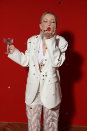 Жакет однобортный объёмного силуэта с расширенным плечевым поясом. Застёжка на одну пуговицу. Из бокового шва выходит декоративная пата. По полочки располжены три прорезных кармана с клапанами, два из которых функциональные.