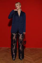 Жакет однобортный объёмного силуэта с расширенным плечевым поясом. Застёжка на одну пуговицу. Из бокового шва выходит декоративная пата. По полочки располжены три прорезных кармана с клапанами, два из которых функциональные.