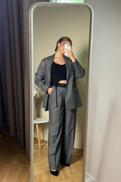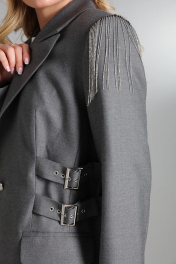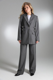 Костюм 2ка, состоящий из жакет и брюк. Однобортный объёмный жакет на подкладке прямого силуэта из костюмной полушерстяной ткани высокого качества. По переду изделия прорезные карманы с клапанами. Рукава втачные двухшовные. Спинка со средним швом и завышенной шлицей. В качестве декора по верхней части оката рукавов пришиты цепочки, а по бокам выполнена имитация ремней из основной ткани с люверсами и пряжкой. Брюки широкого объема, прямого силуэта. На передних половинках брюк заутюжены стрелки, переходящие в складки по линии талии. На задних половинках также заутюжены стрелки. В боковых швах расположены карманы. Пояс брюк на эластичной тесьме, в боковом шве вставлена молния. По переду имитация застёжки-гульфика. Фурнитура и материалы отделки могут незначительно отличаться от тех, что на фотографии Рост фотомодели 169 см. Размер у фотомодели – 44.