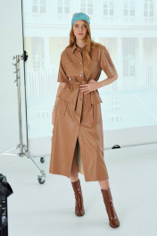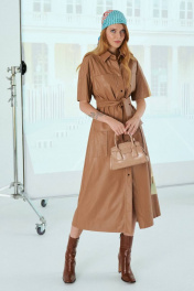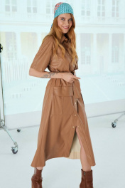 Платье женское полуприлегающего силуэта, длинной миди из эко-кожи карамельного цвета. Рукав реглан, длинной до локтя. Застежка на кнопки по всей длине платья. Воротник рубашечного типа. Линия талии фиксируется поясом, по переду платья выполнены накладные карманы. Идеальный вариант для делового гардероба. Длина платья по спинке: 122 см Длина рукава: 39 см Обхват груди: 92-96-100 см (размер 42-44-46) Обхват талии: 86-90-94 см (размер 42-44-46) Обхват бедер: 102-106-110 см (размер 42-44-46)