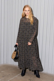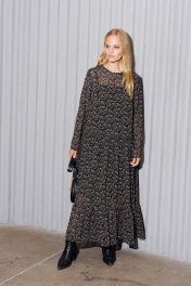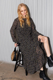 Шифоновое платье, которое идеально подойдёт для создания лёгкого многослойного образа. Платье состоит, из двух слоёв. Верхний слой выполнен из нежного шифона дизайна «веточки», нижний - это комбинация из трикотажной лёгкой подкладки. Платье свободного кроя «А»-силуэта с втачным длинным рукавом. Округлый вырез горловины по переду. По спинке средний шов, переходящий у горловины в разрез на завязке. К нижней части лифа платья ярусами нашиты воланы в сборку, что придаёт платью воздушности и изящества. С шифоновым платьем отлично получаются многослойные образы — это прекрасный вариант для всех сезонов. Длинное шифоновое платье можно комбинировать с удлиненными свитерами, короткими куртками, бомберами, с обувью на каблуке или на плоской подошве. Длина платья по спинке: 129 см Длина рукава: 60 см Обхват груди: 104 – 108 – 112 см (размер 46 – 48 – 50)