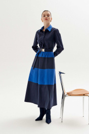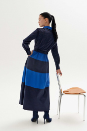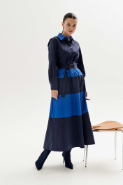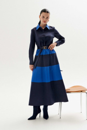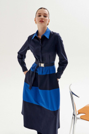 Платье полуприлегающего силуэта выполнено из хлопка в двух цветах: синий и голубой. Рукав втачной, по низу рукава манжета с застёжкой на петли/пуговицы. Воротник рубашечного кроя на стойке, застёжка по платью потайная на петли и пуговицы. По линии талии и юбке платья выполнены горизонтальные подрезы из отделочной ткани. В боковых швах карманы. По спинке: кокетка и две складки, в шов по талии вставлена резинка для удобства движения. К платью прилагается съёмный пояс с металлической пряжкой, с резинкой в области спинки для комфорта и удобства в носке. Длина платья по спинке: 131 см (от горловины до талии 40 см, юбка 91 см) Длина рукава: 63 см ОГ: 90-94-98-102 см (размер 42-44-46-48) ОТ: 76-80-84-88 см (размер 42-44-46-48) ОБ: 108-112-116-120 см (размер 42-44-46-48)