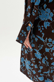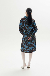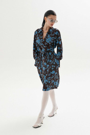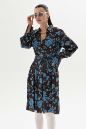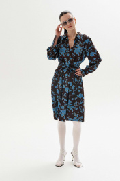 Платье прямого силуэта из приятной ткани. Рукав втачной, по низу широкая манжета с застёжкой на запонки. По переду: средний шов, V-образный вырез, воротник рубашечного кроя на стойке, к которой пристегивается на пуговицы декоративная деталь - цепочка. По спинке кокетка, небольшая сборка от кокетки по центру. К платью прилагается съёмный пояс. Длина платья по спинке: 103 см Длина рукава: 61 см ОГ: 118-122-126-130 см (размер 46-48-50-52) ОБ: 130-134-138-142 см (размер 46-48-50-52)