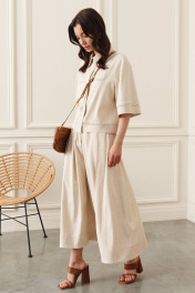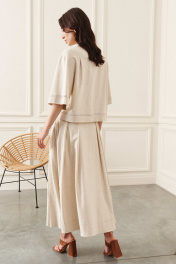 Комплект состоит из блузы и юбки, выполнен из льняной ткани. Блуза свободного кроя, линия плеча спущена. Рукав втачной короткий, по низу рукава вшита ажурная тесьма. Воротник рубашечного кроя на стойке. Отрезная фигурная кокетка, в которую вшита ажурная тесьма, по центру переда планка на застёжку на потайные петли и пуговицы. По спинке отрезная кокетка с глубокими складками по бокам для удобства движения. По низу переда и спинки вставлена ажурная тесьма. Юбка А-силуэта на притачном поясе со шлевками, по переду средний шов, переходящий в застёжку-гульфик. От шва притачивания пояса глубокие, заутюженные складки, в боковых швах карманы. По спинке средний шов и глубокие складки. Блуза: Длина по спинке от высшей точки горловины: 56 см Длина рукава с манжетой: 31,5 см ОГ: 104-108-112-116 см (размер 42-44-46-48) Юбка: Длина: 87 см ОТ: 70-74-78-82 см (размер 42-44-46-48);