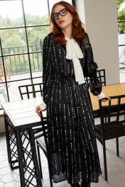 Платье свободного кроя выполнено из плательной ткани на трикотажной подкладке. Рукав втачной, по низу рукава притачная манжета с застёжкой на петлю и пуговицу. По горловине воротник-шарф выполнен из отделочной ткани. Застёжка центральная на петли и пуговицы. Линия талии отрезная, собрана на резинку. Длина платья по спинке от высшей точки горловины: 129 см, от горловины до резинки: 42 см, от резинки до низа платья: 87 см Длина рукава: 61,5 см ОГ: 100-104-108-112 см (размер 42-44-46-48) ОТ: 54-58-62-66 см Рост: 164 см (размер 42-44-46-48), в растяжении: 88-92-96-100 см (размер 42-44-46-48)