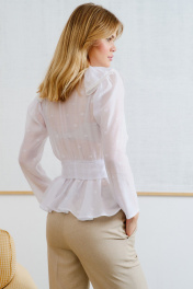 Блуза полуприлегающего силуэта, выполнена из нежной вискозы, дизайн "горох". Рукав втачной, длинный, по верхней части рукава сборка. По переду притачная планка с воланом, по отлету волана вшито кружевная тесьма. У-образный вырез горловины, застёжка центральная на петли и пуговицы. Линия талии отрезная, в шов подреза вшит отлетной пояс. Нижняя часть блуза- "баска", по талии собрана на сборку. Длина по спинке: 61 см Длина рукава: 60 см ОГ: 94-98-102-106 см (размер 42-44-46-48)