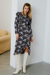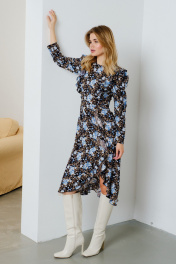 Платье полуприлегающего силуэта, выполнено из вискозной ткани. Отрезное по талии, с застежкой на потайную молнию в среднем шве спинки. Рукав втачной, верхняя часть рукава собрана на сборку. Округлый вырез горловины. Перед платья с рельефами и воланами. Низ платья с ассиметричным фигурным разрезом и воланами с отделкой из сеточки. Длина по спинке: 110 см Длина рукава: 26 см ОГ: 96-100-104-108 см (размер 42-44-46-48) ОТ: 72-76-80-84 см (размер 42-44-46-48) ОБ: 103-107-111-115 см (размер 42-44-46-48)