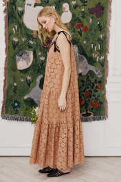 Платье-сарафан свободного кроя из хлопковой ткани ришелье. Хлопковая подкладка до нижнего подреза, по плечам бретели на завязку. По переду и спинке фигурный вырез горловины, обработанный кружевной тесьмой, которая плавно переходит в боковой шов. К лифу пришиты воланы на сборку. Между нижними воланами вшита кружевная тесьма. Длина по спинке от высшей точки горловины: 130 см ОГ: 86-90-94-98 см (размер 42-44-46-48) ОТ: 114-118-122-126 см (размер 42-44-46-48)