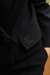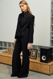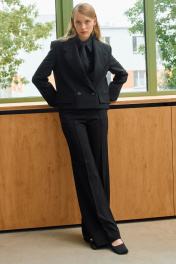 Комплект состоит из жакета и брюк и выполнен из костюмной ткани. Жакет укороченный, свободного кроя на подкладке. Рукав втачной длинный, отлетная шлица по локтевому шву. Воротник пиджачного кроя, застежка двубортная на петли и пуговицы, по бокам прорезные карманы с отлетным клапаном, на левом клапане печать. По спинке средний шов. Брюки прямого силуэта, заутюженные на кант. По линии талии притачной пояс, застежка на молнию и петлю и пуговицу. В боковых швах прорезные карманы. Жакет: Длина по спинке от высшей точки горловины: 58 см; Длина рукава: 60 см; ОГ: 100-104-108-112-116 см (размер 42-44-46-48-50); Брюки: ОТ: 72-76-80-84-88 см (размер 42-44-46-48-50); ОБ: 98-102-106-110-114 см (размер 42-44-46-48-50) Длина: 113 см