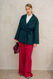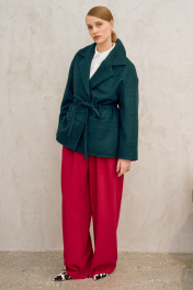 Пальто свободного кроя на подкладке. Линия плеча спущена, рукав длинный. Воротник пиджачного типа, застежка однобортная на потайную кнопку, по линии талии кулиса, в которую втянут пояс на резинке. По бокам накладные карманы. Длина по спинке от высшей точки горловины: 77 см Длина рукава от горловины: 70 см ОГ: 118-122-126-130-134 см (размер 42-44-46-48-50)