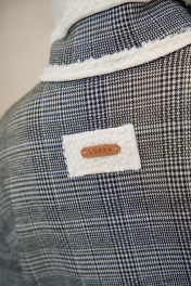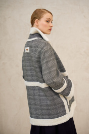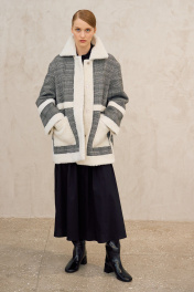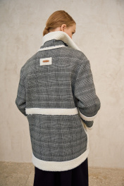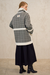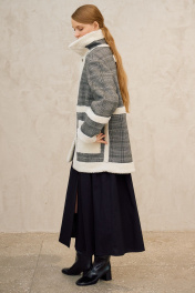 Полупальто свободного кроя. Линия плеча спущена, рукав длинный с отложной манжетой в области рукава подрез. Воротник рубашечного типа, отложной. Застежка центральная на потайные кнопки. Отделочная ткань по борту и низу изделия, по бокам накладные карманы. Длина по спинке от высшей точки горловины: 82 см Длина рукава: 57,5 см ОГ: 124-128-132-136-140-144 см (размер 42-44-46-48-50-52)