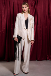 Костюм тройка, состоит из жакета, брюк и топа. Жакет свободного кроя, прямого силуэта на подкладке. Рукав длинный втачной, по локтевому шву шлица. Воротник шалька, центральная застежка на петли и пуговицы. По бокам прорезные карманы с клапаном. По спинке средний шов, переходящий в отлетную шлицу. Топ прямого силуэта, выполнен из блузочной ткани. По переду надстрочное кружево. Топ на регулируемых бретелях. Брюки на притачном поясе с резинкой по спинке, застёжка на молнию и петлю-пуговицу. В боковых швах прорезные карманы. Брюки свободного кроя, прямого силуэта, на притачном поясе. По переду глубокие складки, в боковых швах прорезные карманы. По задней половине брюк талевые вытачки. Жакет: Длина по спинке от высшей точки горловины: 71 см; Длина рукава: 64 см; ОГ: 114-118-122-126-130 см (размер 44-46-48-50-52); Брюки: ОТ: 78-82-86-90-94 см (размер 44-46-48-50-52) ОБ: 108-112-116-120-124 см (размер 44-46-48-50-52) Длина: 112,5 см Топ: Длина по спинке от высшей точки горловины: 61 см ОГ: 90-94-98-102 см