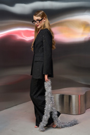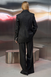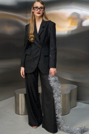 пайетками. Жакет полуприлегающего силуэта, на подкладке. Рукав втачной. По переду воротник с лацканом, застёжка центральная на потайные кнопки. По бокам прорезные функциональные карманы с отлетными клапанами, по спинке средний шов и рельефы. Брюки прямого силуэта с завышенной линией талии и цельнокроеным поясом, по бокам прорезные карманы. Застёжка на задней половине брюк по линии сидения. По переду брюк от линии пояса вертикальные защипы. Жакет: Длина по спинке от высшей точки горловины: 75 см; Длина рукава: 60 см; ОГ: 92-96-100-104-108 см (размер 42-44-46-48-50); Брюки: ОТ: 72-76-80-84-88 см (размер 42-44-46-48-50) ОБ: 96-100-104-108-112 см (размер 42-44-46-48-50) Длина: 112,5 см