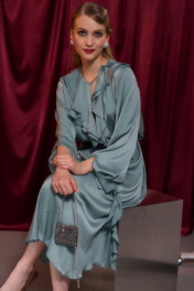 Платье свободного кроя, А силуэта. Рукав втачной на манжете. В Y-образный вырез горловины вшиты воланы. По горловине застежка на завязку. Длина по спинке от высшей точки горловины: 122 см Длина рукава: 64 см ОГ: 110-114-118-122-126-130-134-138 см (размер 42-44-46-48-50-52-54-56) ОТ: 104-108-112-116-120-124-128-132 см (размер 42-44-46-48-50-52-54-56) ОБ: 120-124-128-132-136-140-144-148 см (размер 42-44-46-48-50-52-54-56)
