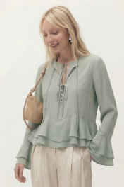 Блуза свободного кроя из шифона. Рукав втачной длинный, по низу рукава волан. Перед блузы состоит из двух слоев. Нижний слой с округлым вырезом горловины с застежкой на завязку и на навесные пуговицы и петли. Верхний, основной слой с округлым вырезом горловины на завязку и в области груди завязки. По низу воланы пришиты по переду и спинке в волнообразный подрез. Длина по спинке от высшей точки горловины: 55 см Длина рукава: 62 см ОГ: 94-98-102-106 см (размер 42-44-46-48)