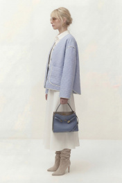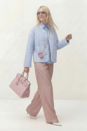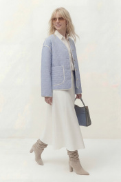 Куртка свободного кроя, облегченная, без подкладки и синтепона. Линия плеча спущена, рукав длинный. V-образный вырез горловины. Застежка однобортная на петли и пуговицы. По бокам накладные карманы. По спинке средний шов. Шов втачивания рукава, низ рукава, горловина, борт, карман, средний шов спинки обработан окантовкой из отделочной ткани. Куртка: Длина по спинке от высшей точки горловины: 73 см Длина рукава от горловины: 76 см ОГ: 122-126-130-134-138-142 см (размер 42-44-46-48-50-52)