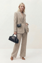 Комплект состоит из жакета и брюк. Жакет свободного кроя прямого силуэта на подкладке. Рукав втачной длинный, шлица по локтевому шву. Воротник пиджачного кроя, застежка однобортная на петли и пуговицы, по бокам накладные карманы. По спинке средний шов и рельефы. Брюки прямого силуэта с завышенной линией талии и цельнокроеным поясом, по бокам прорезные карманы. Застёжка на задней половине брюк по линии сидения. По переду брюк от линии пояса вертикальные защипы. Жакет: Длина по спинке от высшей точки горловины: 74 см; Длина рукава от горловины: 60 см; ОГ: 106-110-114-118 см (размер 44-46-48-50); Брюки: ОТ: 76-80-84-88 см (размер 44-46-48-50); ОБ: 106-110-114-118 см (размер 44-46-48-50) Длина: 115 см