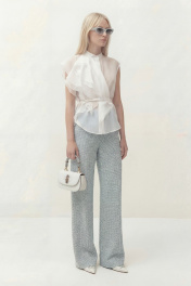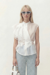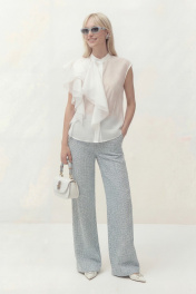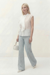 Блуза прямого силуэта, по горловине воротник-стойка. Центральная застежка на петли и пуговицы. На левой стороне блузы настрочные воланы. Длина по спинке от высшей точки горловины: 60 см Длина рукава: 62 см ОГ: 104-108-112-116 см (размер 42-44-46-48)