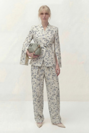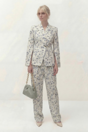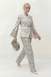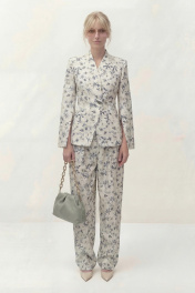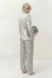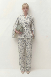 Костюм брючный, выполнен из плательно-костюмной ткани. Жакет полуприлегающего силуэта на подкладке, застежка на одну петлю и пуговицу. Рукав втачной длинный, по шву разрезы. На шлице рукава пуговица. Воротник стойка. Низ борта закругленный. По бокам прорезные карманы в рамку. По спинке средний шов, переходящий в отлетную шлицу, и рельефы. Брюки на притачном поясе с резинкой по спинке, застёжка на молнию и петлю-пуговицу. В боковых швах прорезные карманы. Брюки свободного кроя, прямого силуэта, на притачном поясе. По переду глубокие складки, в боковых швах прорезные карманы. По задней половине брюк талевые вытачки. Жакет: Длина по спинке от высшей точки горловины: 66 см Длина рукава: 62 см ОГ: 102-106-110-114-118 см (размер 46-48-50-52-54) Брюки: ОТ: 82-86-9094-98 см (размер 46-48-50-52-54) ОБ: 118-122-126-130-134 см (размер 46-48-50-52-54) Длина: 112,5 см