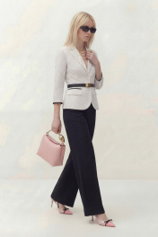 Костюм брючный. Жакет на хлопковой подкладке. Рукав втачной ¾, по низу рукава отделка. По переду воротник пиджачного типа с лацканом, застёжка на петли и пуговицы, по бокам прорезные функциональные карманы с клапаном, от шва кармана выходит нагрудная вытачка. По спинке средний шов. Брюки свободного кроя на притачном поясе на резинке, в боковых швах прорезные карманы, по низу отлетные шлицы. Жакет: Длина по спинке от высшей точки горловины: 60 см; Длина рукава: 48 см; ОГ: 92-96-100 см (размер 42-44-46); Брюки: ОТ: 60-64-68 см (размер 42-44-46), в растяжении 76-80-84 см (размер 42-44-46) ОБ: 96-100-104-108 см (размер 42-44-46-48) Длина: 107,5 см