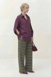 Блуза выполнена из хлопка свободного кроя. Рукав втачной длинный, по переднему шву рукава застежка на петли и пуговицы, по низу рукава манжета. По горловине воротник рубашечного типа на стойке. По переду планка с застежкой на петли и пуговицы. Брюки из нежной вискозной ткани свободного кроя, прямого силуэта, по талии на резинке, в боковых швах карманы. Блуза: Длина по спинке от высшей точки горловины: 71 см Длина рукава от горловины: 76 см ОГ: 114-118-122-126-130 см (размер 42-44-46-48-50) Брюки: ОТ: 66-70-74-78-82 см (размер 42-44-46-48-50), в растяжении 80-84-88-92-96 см (размер 42-44-46-48-50) ОБ: 106-110-114-118-122 см (размер 42-44-46-48-50) Длина: 116 см