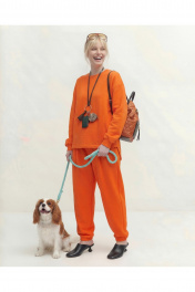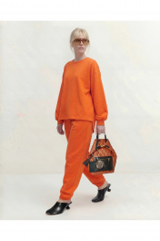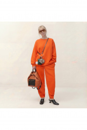 Комплект состоит из джемпера и брюк, выполнен из трикотажного полотна (футер). Джемпер свободного кроя. Рукав спущенный, по низу сборка и притачная манжета, по горловине планка, по переду косые рельефы и пришивная нашивка, асимметричный низ. По спинке горизонтальный подрез и округлый низ. Брюки заужены к низу, на притачном поясе, резинка по задней части пояса, в боковых швах карманы. Джемпер: Длина по спинке: 76 см; Длина рукава: 50 см (+20 см плечевой пояс); ОГ: 130-134 см (размер 48-50); Брюки: ОТ (резинка, мин/макс): 80/98 - 84/102 см (размер 48-50); Длина с поясом: 104 см